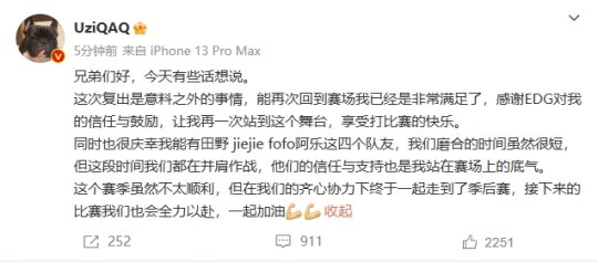 Uzi选手刚刚在个人微博上发文,感谢了自己队伍及队友们,并对之后的季后赛做出展望;长文内容如下: