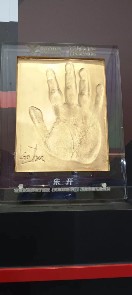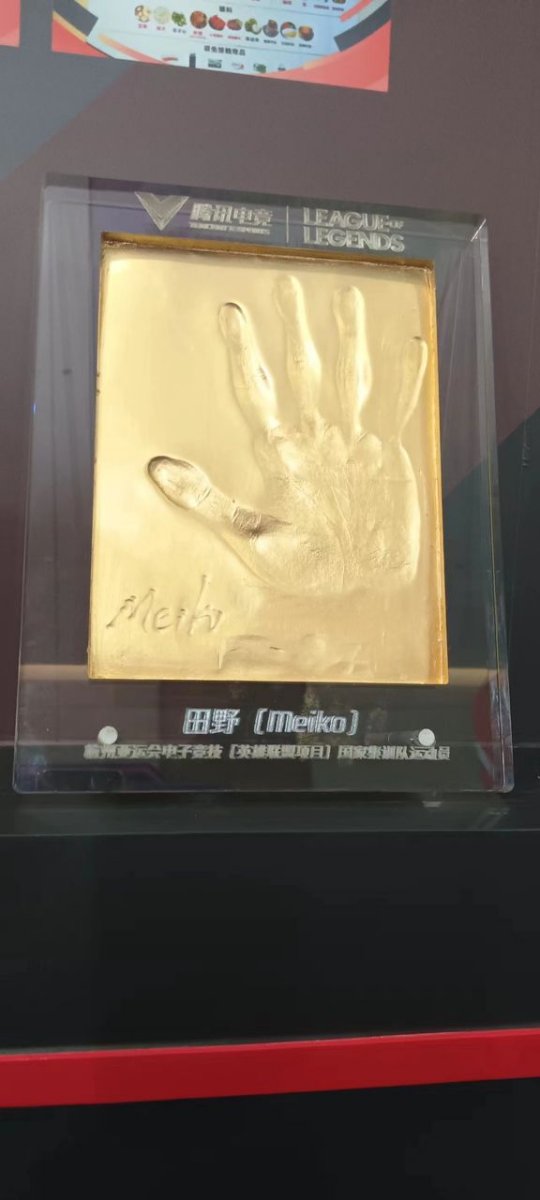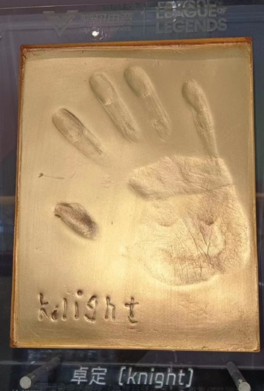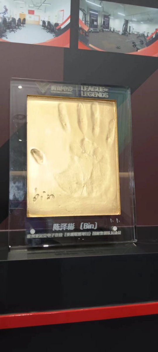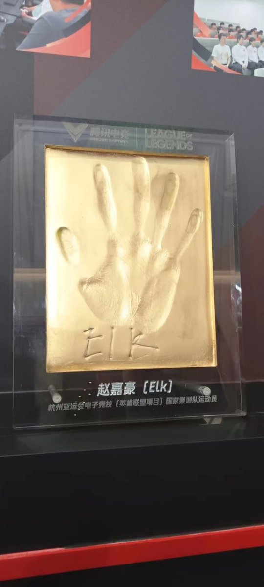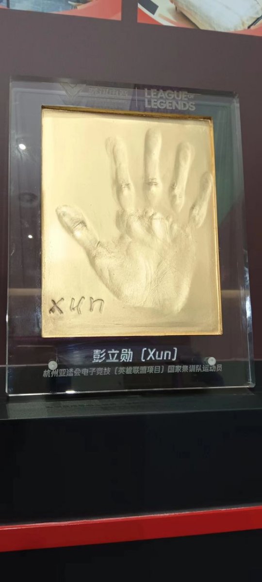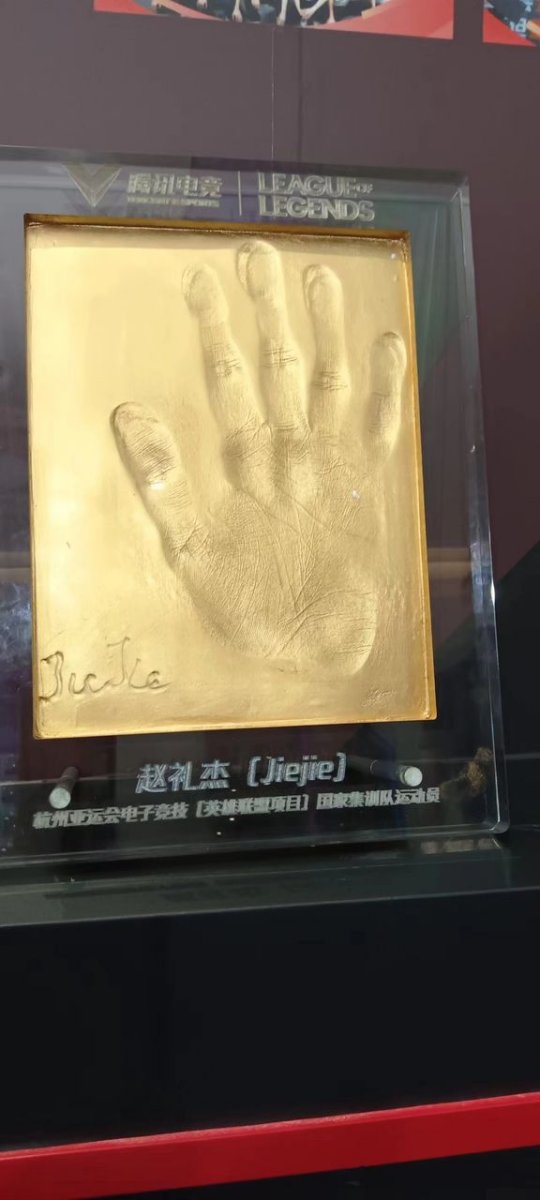 杭州亚运会电子竞技(英雄联盟项目)国家集训队队员陈泽彬(bin)、彭立勋(xun)、赵礼杰(Jiejie)、knight(卓定)、赵嘉豪(Elk)、Meiko(田野)、朱开(KenZhu)的掌印及签名公布。