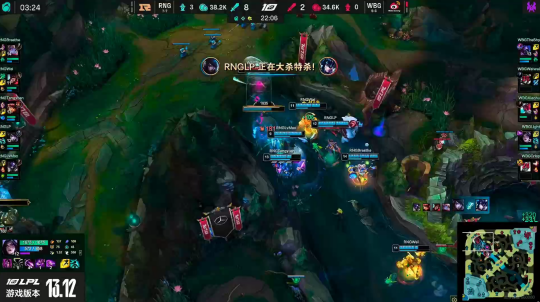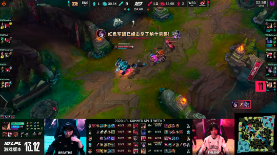 第二局比赛中两支队伍打的十分的稳,一直到11分钟呼吸哥在上路单杀了THESHY才爆发一血。一分钟过后两队五人在河道的团战,RNG打出一换三。