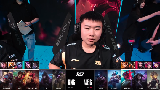 北京时间7月14日,LPL夏季赛常规赛第六周第五个比赛日RNG对阵WBG。第一局Weiwei的波比前期完美节奏带动三路,刘青松的洛在中后期开团保护让WBG在第一局直接零封RNG;第二局RNG的“铜墙铁壁”阵容将WBG阵容克制死死的,WBG每次打团都冲不进去,三路毫无优势最终输掉第二局;第三局WBG的梦魇前期带动节奏,沙皇卡莎在中后期接管团战。最终WBG鏖战三局2-1战胜RNG。