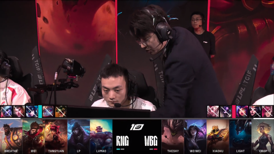 RNG正面已经不敌WBG,只能通过单带拉扯硬拖WBG的大龙时间。WBG则是将单带的RNG打回城,开始抱团推高地,在高地上WBG直接平推,零封RNG拿下第一局。