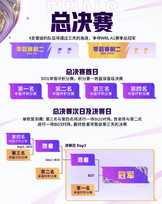 决赛阶段将分三日进行,首日7月21日,决赛会师的四支队伍将进行6场BO1积分赛,通过积分决定第二日比赛的队伍。第二日7月22日,将分别进行一场BO3和一场BO5的淘汰赛,两场比赛的胜者将在第三日的决赛会面。最后一日7月23日,经历重重选拔后终于脱颖而出的两支队伍将通过BO7决出首个英雄联盟手游亚洲联赛的冠军。