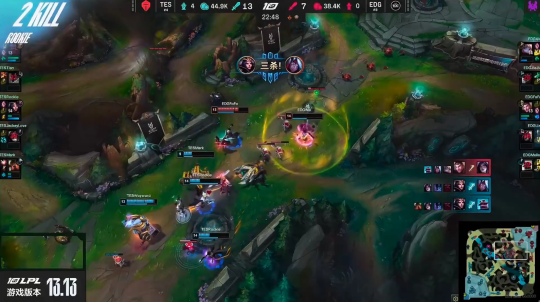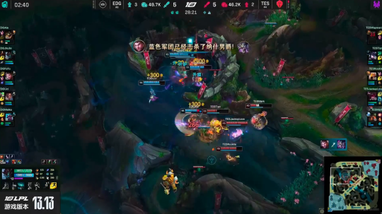比赛20分钟TES在上半野区将EDG蝎子与大树击杀,TES借机拿下大龙。随后两分钟TES在下路越塔将EDG上野击杀,TES继续追击又将沙皇击杀,EDG中下两路高地被TES推掉。
