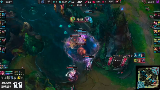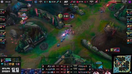 来到中期WBG控下三条小龙,正面团战双方打的一来一回。WBG手握三条小龙所以对比赛时间往后拖一点都不慌。24分钟第四条小龙团,WBG也是将LNG团灭成功拿下土龙魂。随后大龙争夺战,LNG也是溃败,WBG拿下大龙,并将LNG中上野三人击杀。
