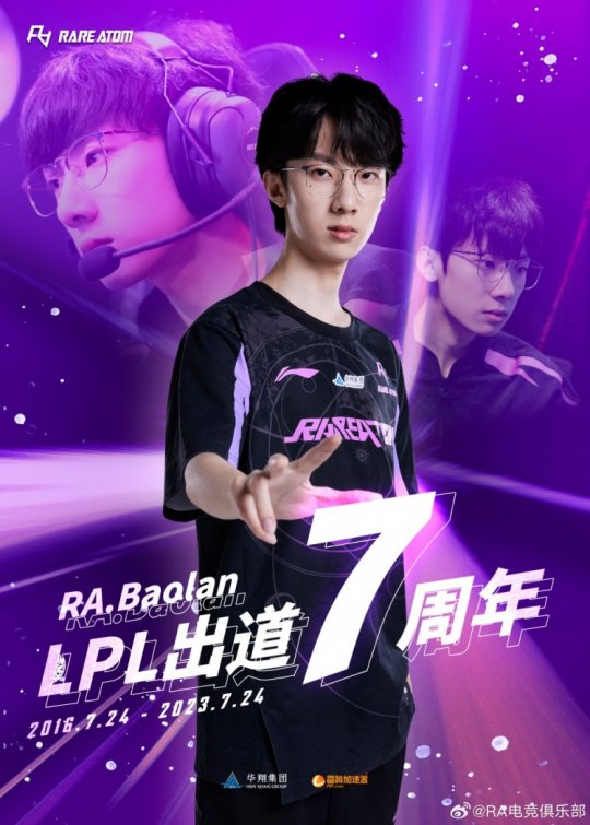 RA电子竞技俱乐部官博更新,发布辅助选手王柳羿(ID:Baolan)征战LPL七周年的纪念海报,并配文:祝我们的Baolan选手出道七周年快乐!愿你接下来的职业征途也能继续心怀炽热,光芒万丈!