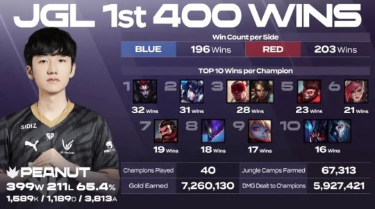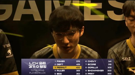 在正在进行2023年LCK夏季赛常规赛第二轮GEN对战LSB的比赛中,GEN获得了第一场比赛的胜利,Peanut也成为了LCK联赛中第一位达到400胜场的打野位置选手。同时他在LCK历史胜场数排名第三,仅次于Faker以及Deft。