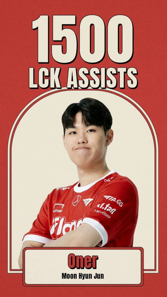 LCK的T1对阵DRX的比赛中,Oner选手达成LCK1500助攻!