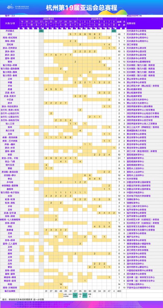 杭州亚运会总赛程2.2版本发布,其中电子竞技项目将于9月24日至10月2日进行,届时将决出7枚金牌归属。