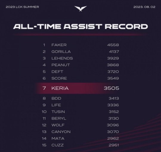 在2023LCK夏季赛今日的比赛中,T1战队Keria选手获得LCK赛区第3500次助攻!Keria在历史助攻排行榜上排名第七!