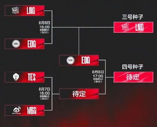 在8月7日下午16:00,WBG与TES的BO5对决,胜者将在8月8日17:00对阵EDG。