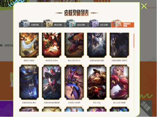 十二周年战斗之夜皮肤宝箱共分五档,个人积分0分即可开启白银宝箱,100积分即可开启黄金宝箱,300积分可开启铂金宝箱。当个人积分达200,且总积分为500时,即可开启钻石宝箱。个人积分达到350分,总分为900分时,即可解锁最顶级的超级战斗宝箱!宝箱等级越高,所能获得的皮肤奖励越好!