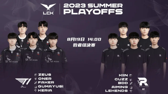 2023LCK夏季赛败者组决赛,T1对阵KT的比赛将于今日14:00开赛,两队的首发名单如下:
